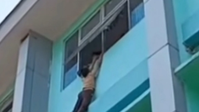 Dalam rekaman video amatir yang menyebar cepat, terlihat jelas seorang siswa berseragam sekolah dasar sedang berpegangan erat pada kusen jendela kelas yang terbuka.